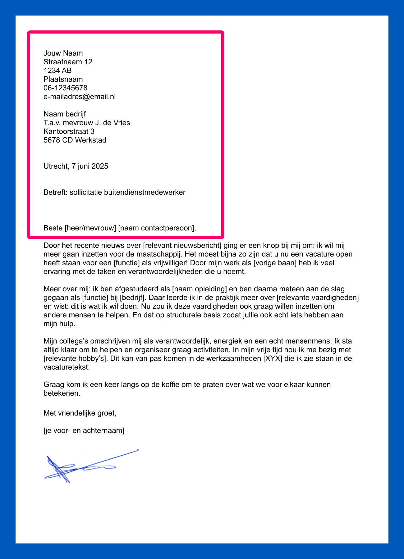 Jouw Naam Straatnaam 12 1234 AB Plaatsnaam 06-12345678 e-mailadres@email.nl Naam bedrijf T.a.v. mevrouw J. de Vries Kantoorstraat 3 5678 CD Werkstad Utrecht, 7 juni 2025 Betreft: sollicitatie buitendienstmedewerker Beste mevrouw De Vries,