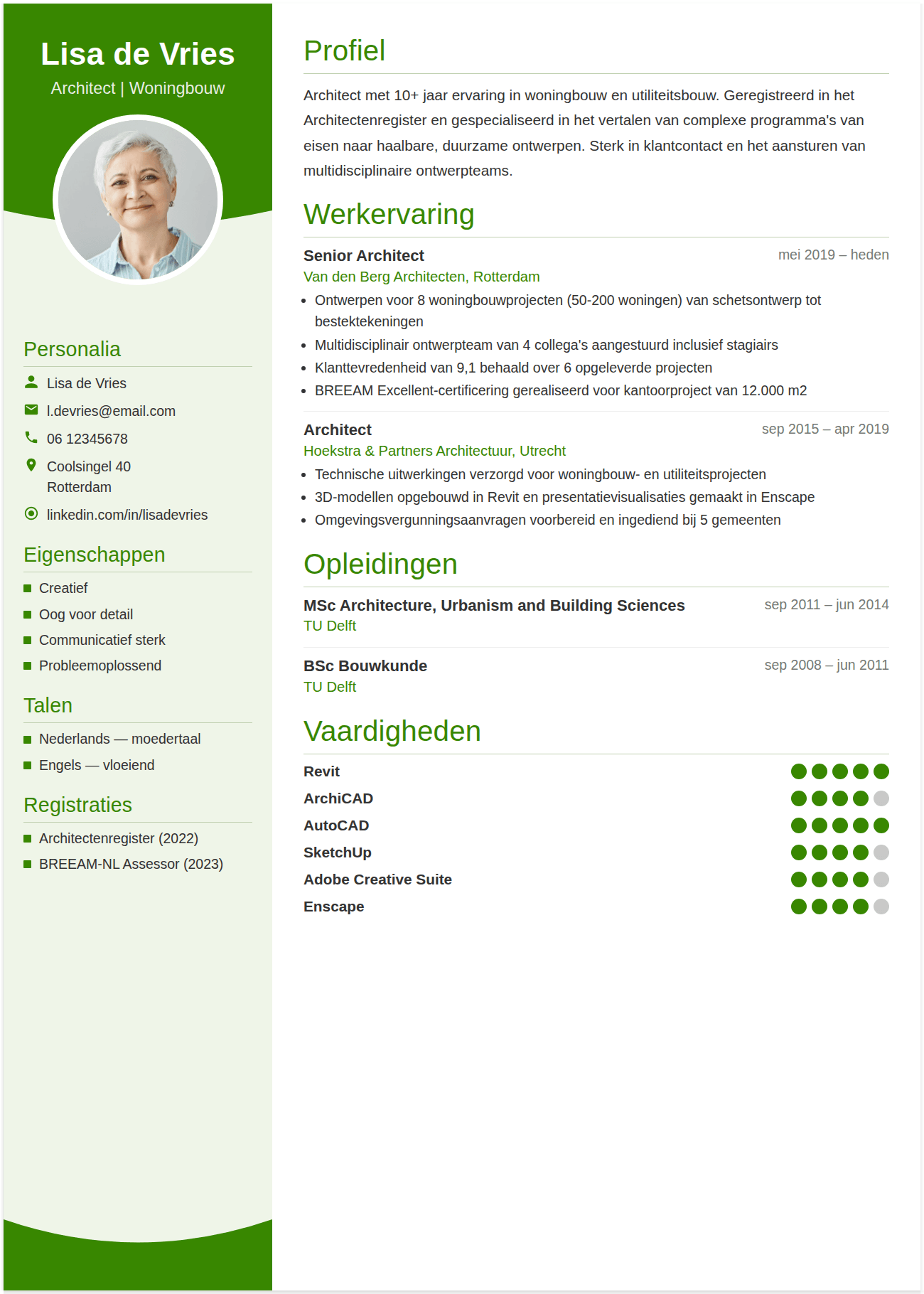 Zorg dat je registratie in het Architectenregister al in je cv-titel of contactgegevens zichtbaar is. Bijvoorbeeld: “Lisa de Vries | Architect (geregistreerd Architectenregister)”.
