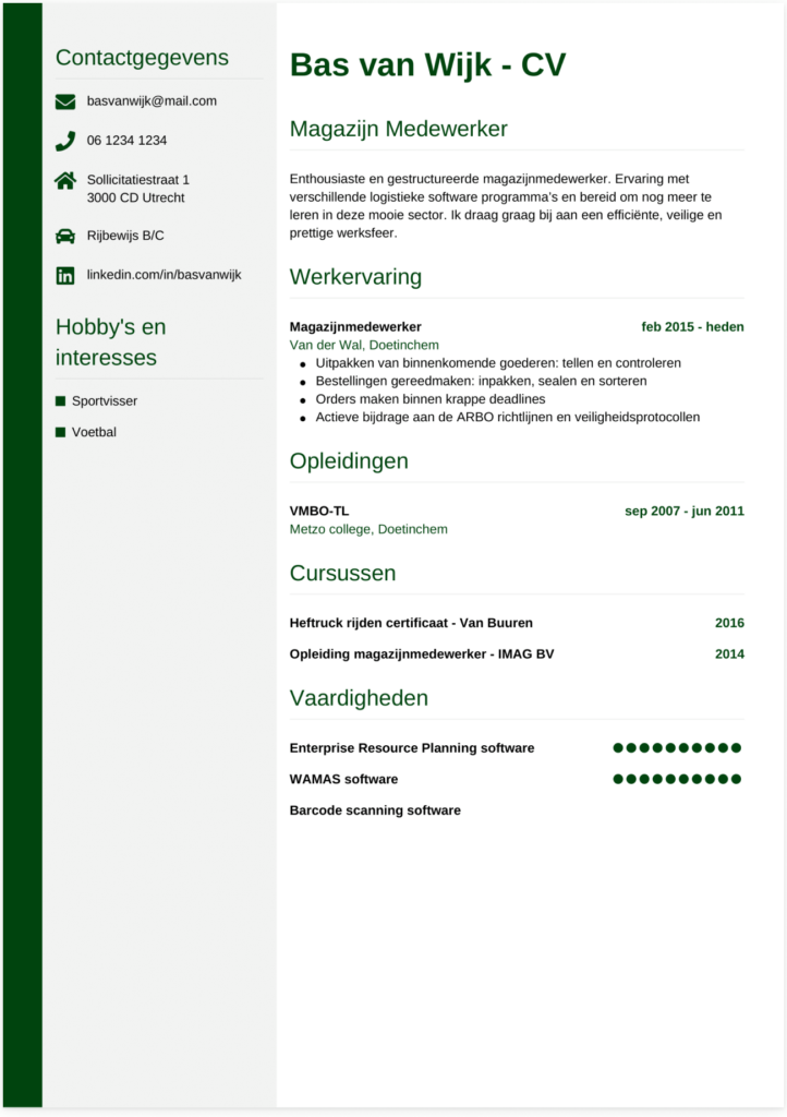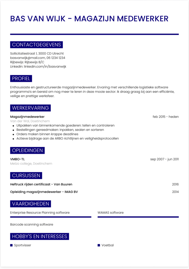 Ben je bezig met het maken van een cv voor de functie van magazijnmedewerker? Bekijk dit praktische cv voorbeeld en handige cv tips.