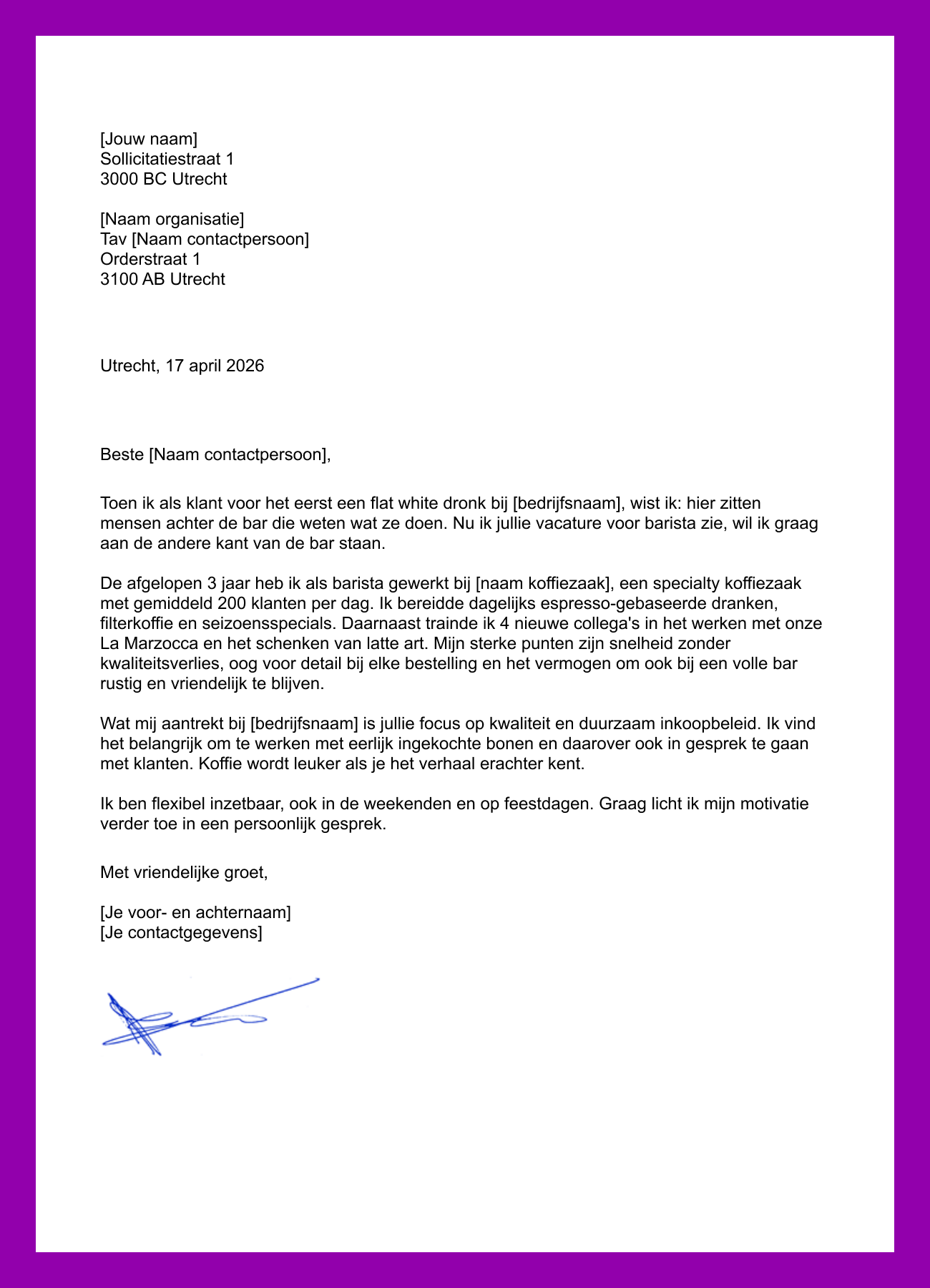 Onderstaand voorbeeld is bedoeld voor iemand die al werkervaring heeft als barista of in de horeca. Pas de brief aan op je eigen situatie en de vacature waar je op reageert.