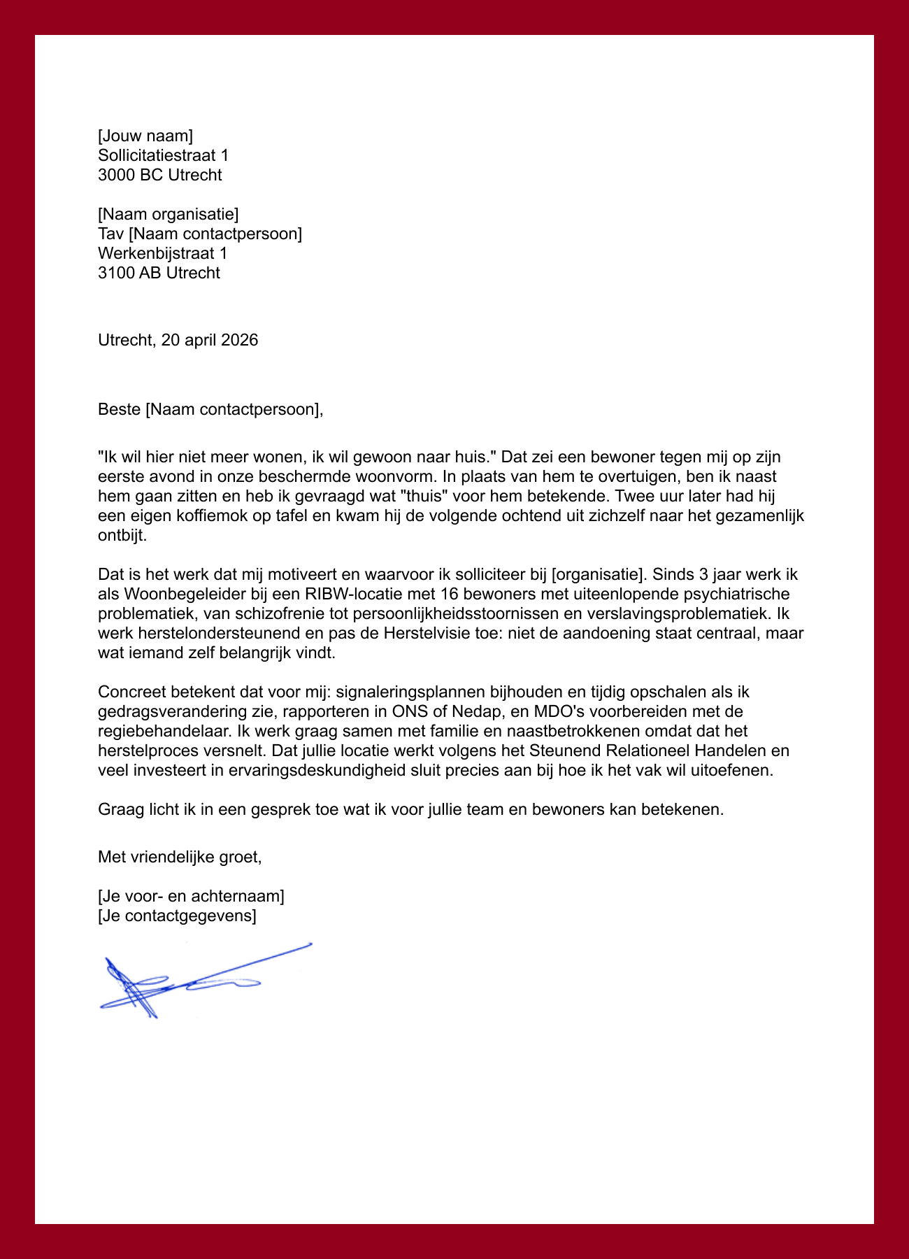 Gebruik deze brief als je solliciteert bij een RIBW, Kwintes, GGZ Noord-Holland-Noord of een andere instelling voor beschermd wonen. De focus ligt op herstelondersteunend werken en signalering.
