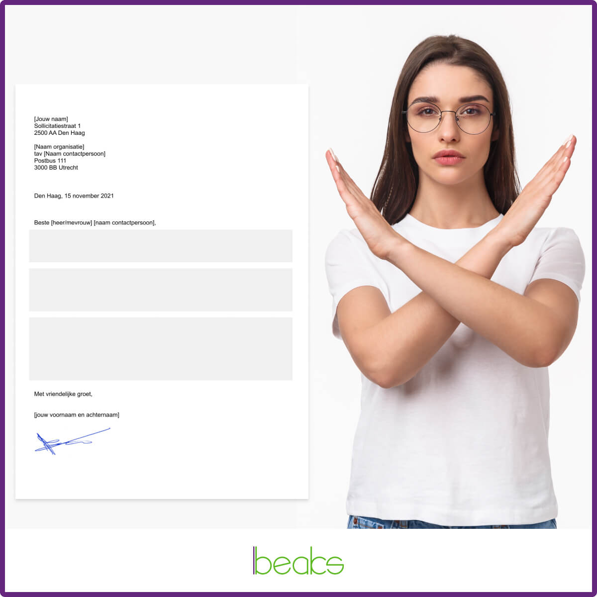 Een brief zonder aanhef, of met “Geachte heer/mevrouw” terwijl de naam van de contactpersoon in de vacature staat, oogt slordig. Het signaleert dat je niet de moeite hebt genomen om te kijken bij wie je solliciteert.